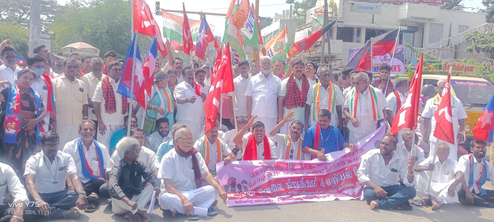 ஒன்றிய பாஜக அரசின் தொழிலாளர் மற்றும் மக்கள் விரோதக் கொள்கைகளைக் கண்டித்து, பிப்ரவரி 12 அன்று புதுச்சேரியின் 9 முக்கிய மையங்களில் மாபெரும் மறியல் போராட்டம் நடைபெற்றது.