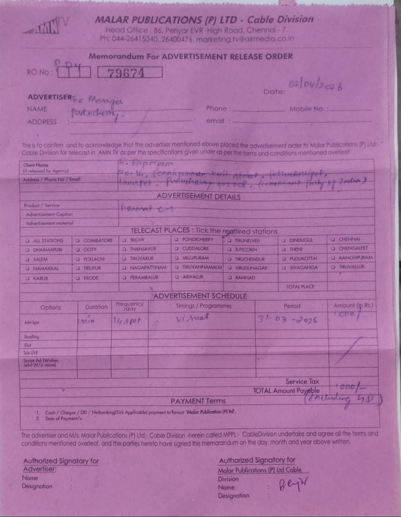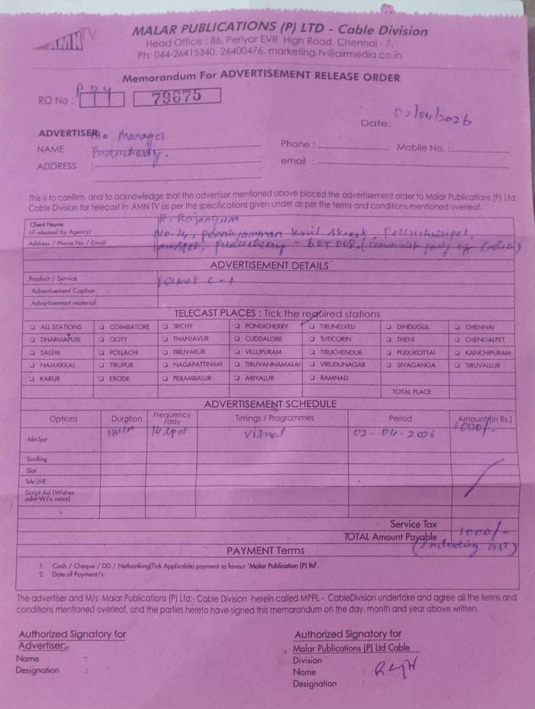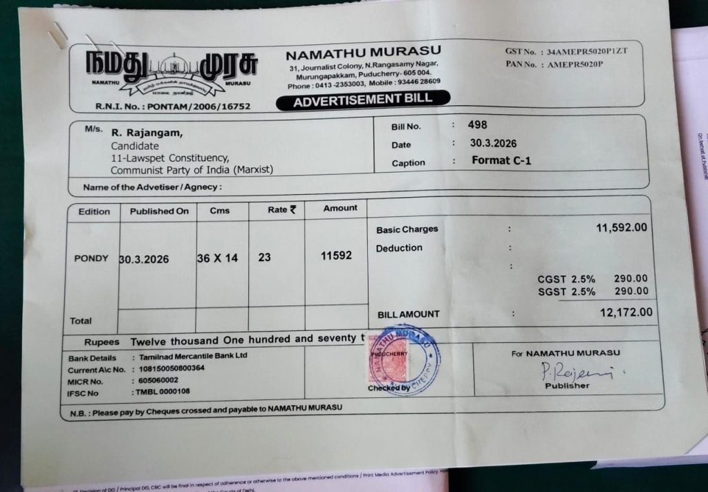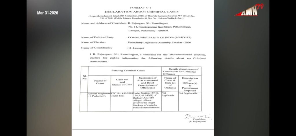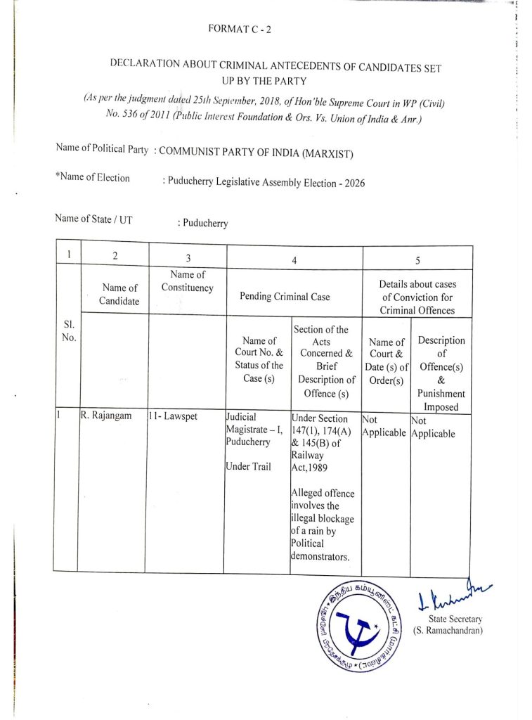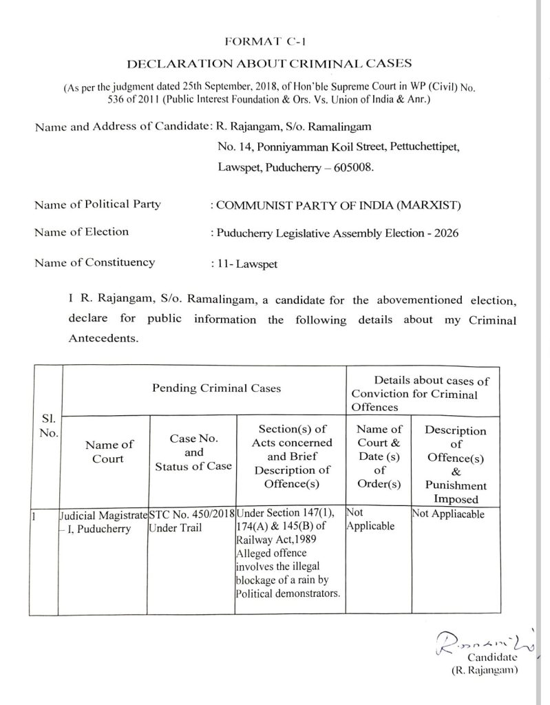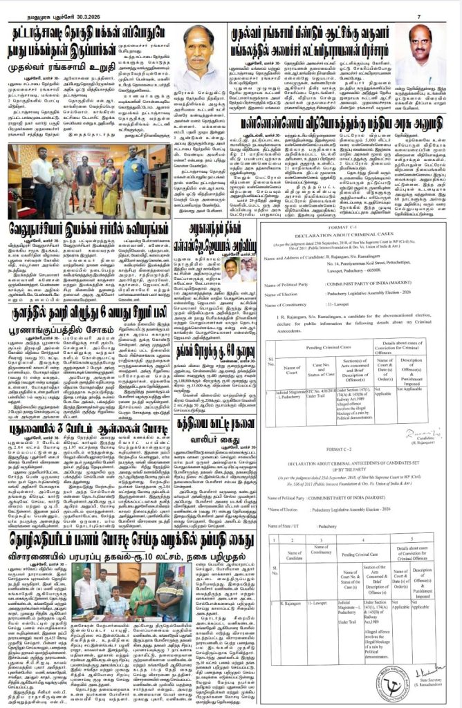 2026 புதுச்சேரி சட்டப்பேரவைத் தேர்தலில் போட்டியிடும் வேட்பாளர் தனது குற்றப் பின்னணி குறித்து பொதுமக்களின் தகவலுக்காக வெளியிடும் அறிவிப்பு.