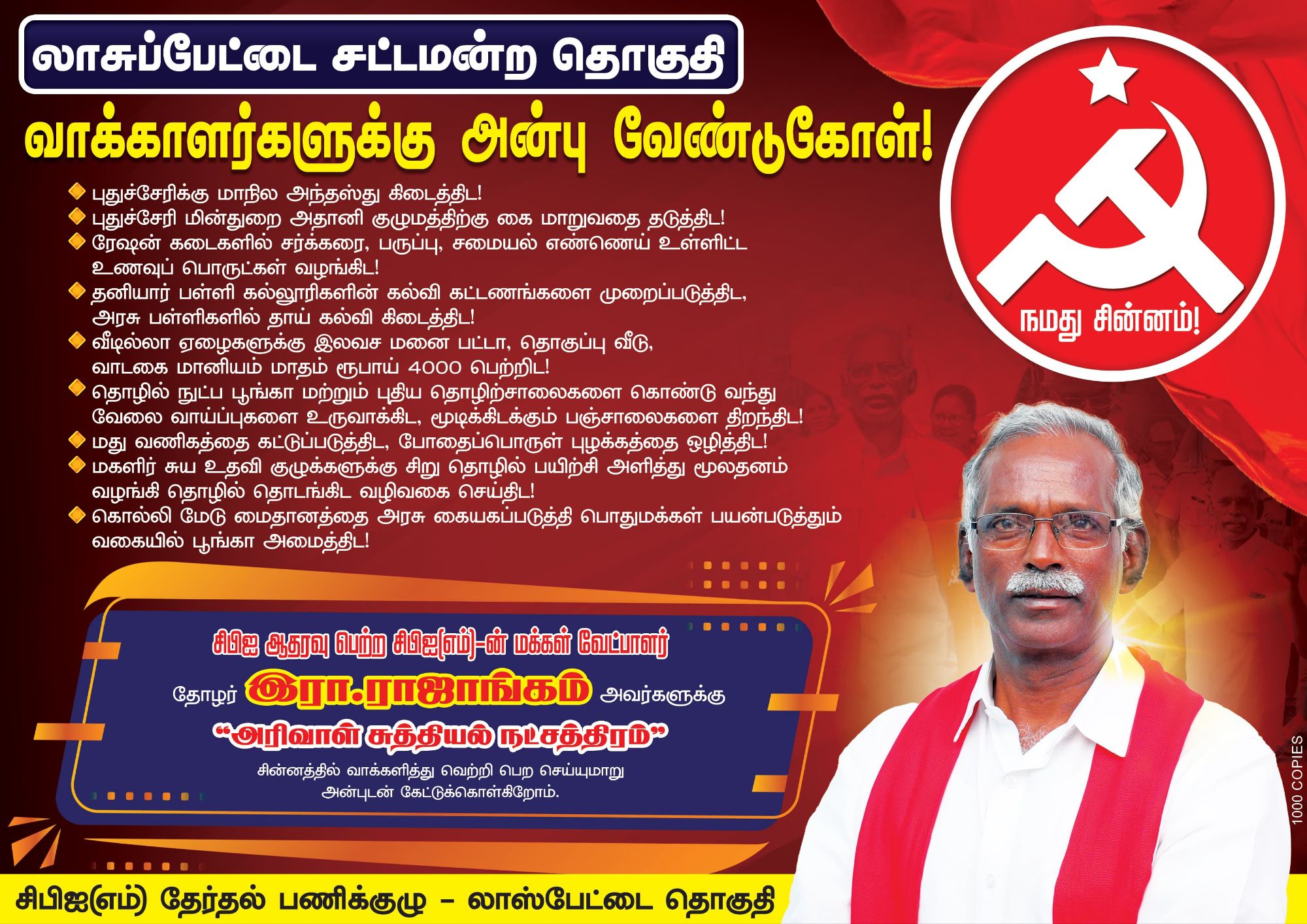 வேட்பாளர் அறிமுகம்: இரா. ராஜாங்கம் (வயது 64) லாஸ்பேட்டை தொகுதிக்கு உட்பட்ட பெத்துசெட்டிப்பேட்டையில் வசித்து வரும் இரா. ராஜாங்கம், எளிய பின்னணியைக் கொண்டவர்.