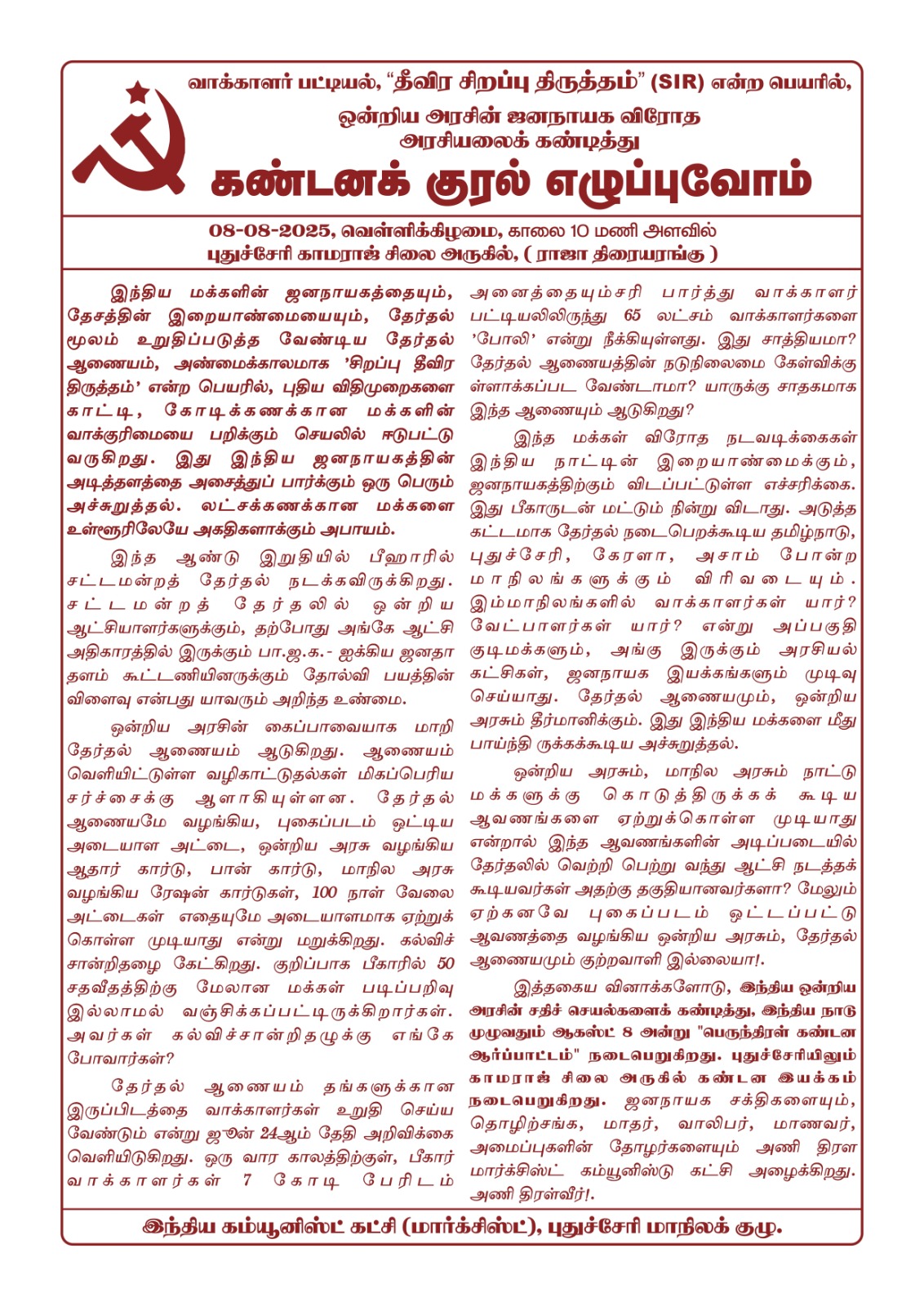 வணக்கம். “சிறப்பு தீவிர சீர் திருத்தம் (Special Intensive Revision – SIR)” என்ற பெயரில், ஒன்றிய அரசு கோடிக்கணக்கான மக்களின் வாக்குரிமையைப் பறிக்கும் ஜனநாயக விரோத அரசியலைக் கண்டித்து, புதுச்சேரி காமராஜ் சிலை அருகில் நாளை (08.08.2025) காலை 10 மணிக்கு கண்டன ஆர்ப்பாட்டம் நடைபெறும்.